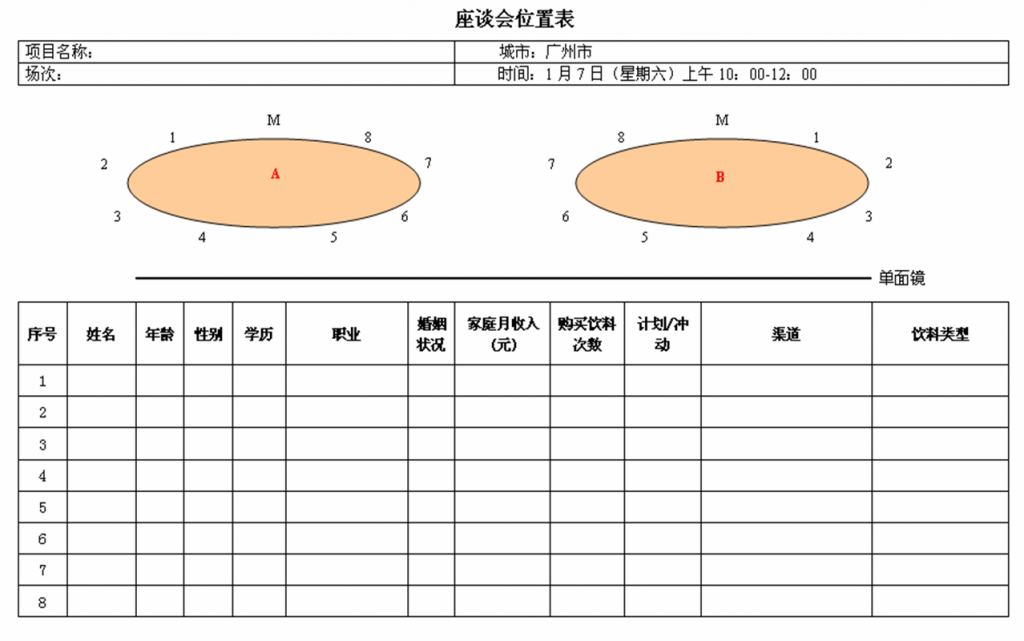 我们看看以下两张座谈会位置表,每张位置表都有以上两种编号方法。假设一下,当你坐在单面镜后面,拿着座谈会位置表,你会觉得哪种编号方法更好呢?